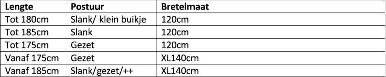 Onderstaand vind u gemakkelijk aan de hand van uw lengte en postuur welke bretel maat het beste bij u past.